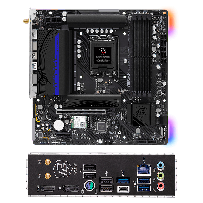 Motherboard Asrock B760M PG Riptide WiFi, Chipset Intel B760, LGA1700, mATX,soporta procesadores de 14th, 13th y 12th generación Intel Core i9/ i7/i5/i3/Pentium Gold, Celeron, 4 x ranuras de memoria DDR5, máximo de 192GB, almacenamiento 2 x M.2 Key-M slots / 4 x SATA 6Gb/s, Sonido Realtek 7.1 Audio HD Codec, 1 x Realtek 2.5Gbps Ethernet RJ-45, Wi-Fi 6E 802.11 a/b/g/n/ac/ax / 2.4/5GH, bluetooth 5.3