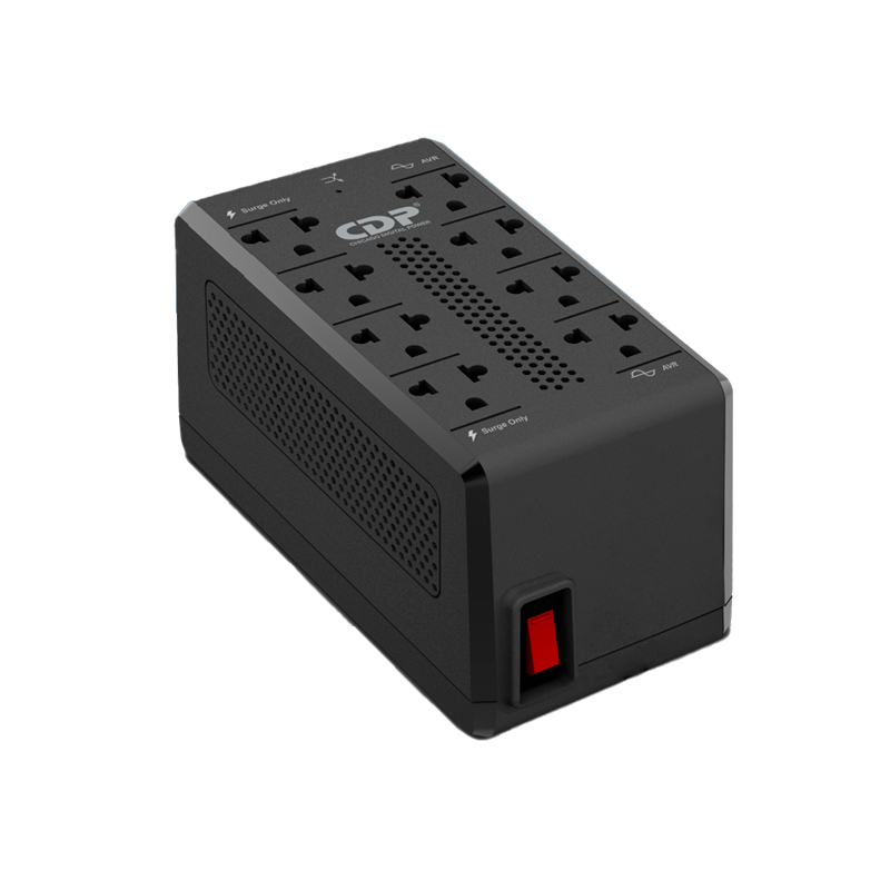 Estabilizador automático de voltaje con supresion de picos CDP RAVR1008i, 900VA/450Watts, para proteger pantallas LED/LCD, computo, audio/video, impresoras, escaneres, entretenimiento. consolas de juegos y mucho mas, cuenta con botón de encendido y breaker de protección, 8 salidas Nema Universal (4 con AVR / Supresion y 4 con supresion de picos), Cable de entrada y Orificios para montaje de pared