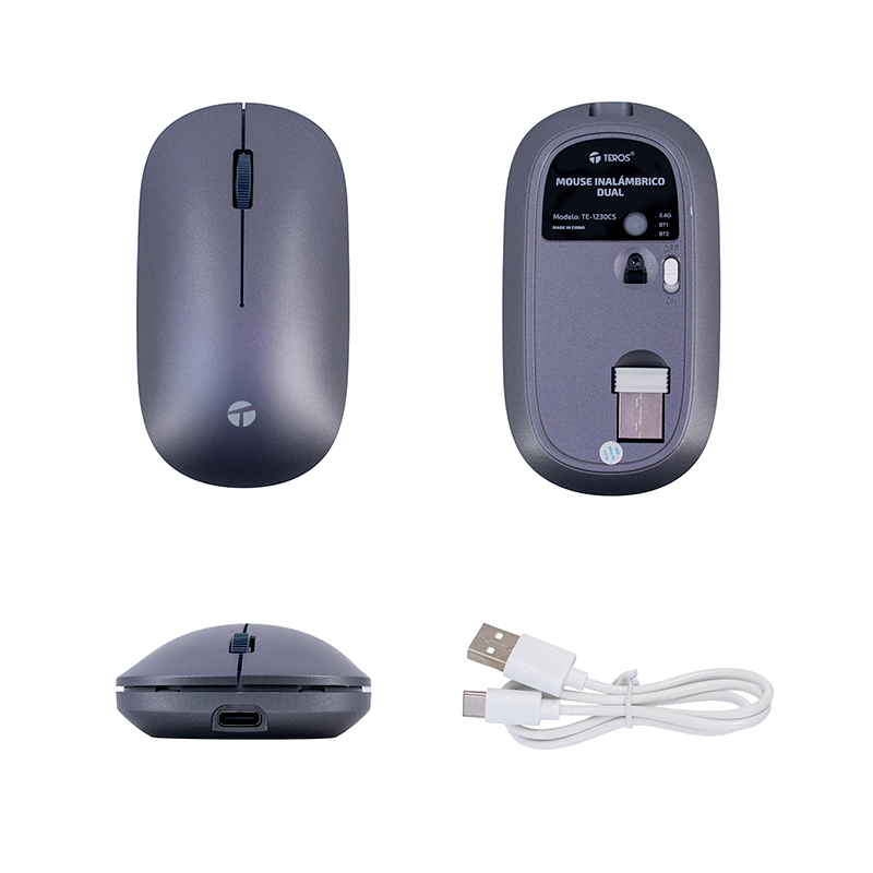 Mouse inalámbrico dual TerosTE-1230CS, 3 botones, 1200DPI, con diseño compacto y conexión de 2.4 GHz, cobertura de 20 mt. y compatibilidad con bluetooth 5.0, 3 botones, 1200 DPI y escaneo de 3000 FPS, ideal para tareas diarias, su baterÃa recargable de 600 mAh brinda mayor autonomÃa y su durabilidad alcanza los 5 millones de clics, compatible con Windows 8, 10 y 11