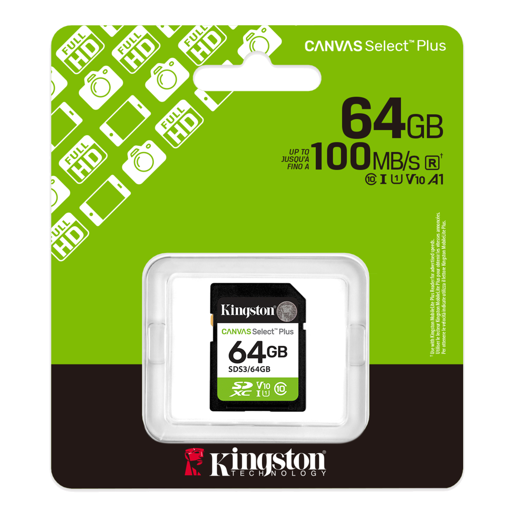 Memoria Card SD Kingston SDS3/64GB SD Canvas Select Plus, 64GB, categorÃa de velocidad: UHS-I/U1/V10, velocidad de lectura hasta 100MB/s