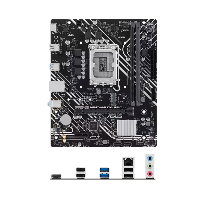 Motherboard Asus PRIME H610M-F D4 R2.0, Chipset Intel H610, LGA1700, micro-ATX, soporta procesadores de 14th, 13th y 12th generación Intel Core i9 / i7 / i5 / i3 / Pentium Gold / Celeron, 2 x ranuras de memoria DDR4 / máximo de 64GB, Almacenamiento 1 x M.2 Key-M slots / 2 x SATA 6Gb/s, Sonido Realtek 7.1 Sound High definition Audio CODEC, 1 x Realtek 1Gbps Ethernet (RJ-45), formato micro-ATX