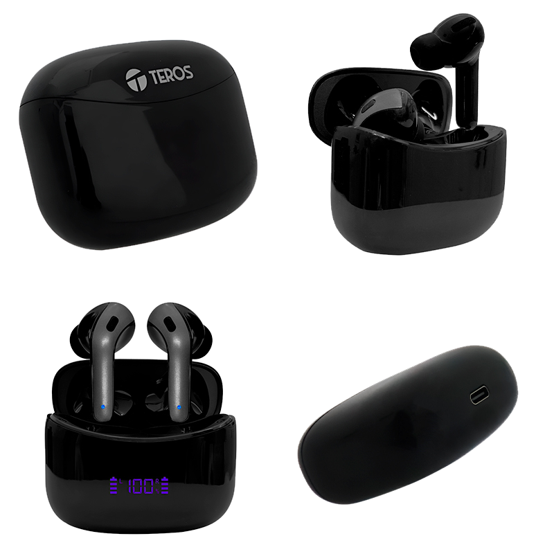 AudÃfonos TerosTE-8074N, con bluetooth 5.3, TWS, control por toque y un alcance de transmisión de 10 metros, ofrecen hasta 5.5 horas de reproducción, 4 horas de conversación y 150 horas en reposo, equipados con baterÃa de 40 mAh en los audÃfonos y 400 mAh en el estuche, con carga rápida en 1 - 2 horas mediante puerto USB tipo C, diseño resistente al agua con certificación IPX5, color negro